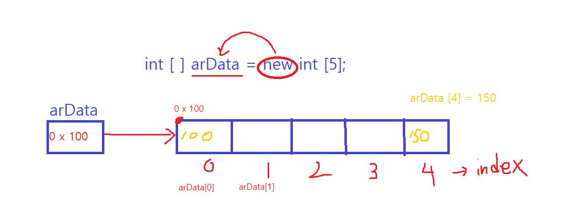 int [ ] arData = new int [5]; > int 타입의 저장공간 5개