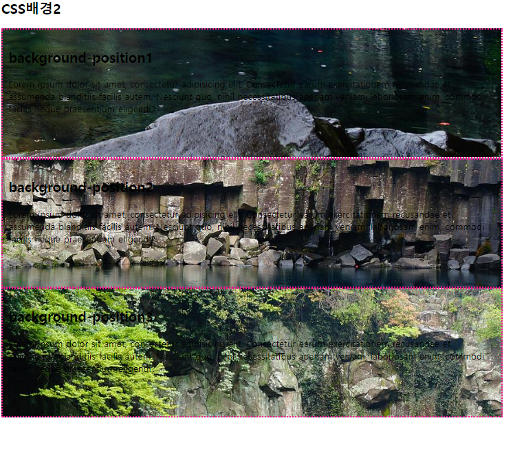 | background-position | 반복되지 않는 배경 이미지의 상대 위치를 설정 %나 px을 사용하여 상대위치를 정할 수 있음 상대위치를 정하는 기준은 해당 요소의 왼쪽 상단 |